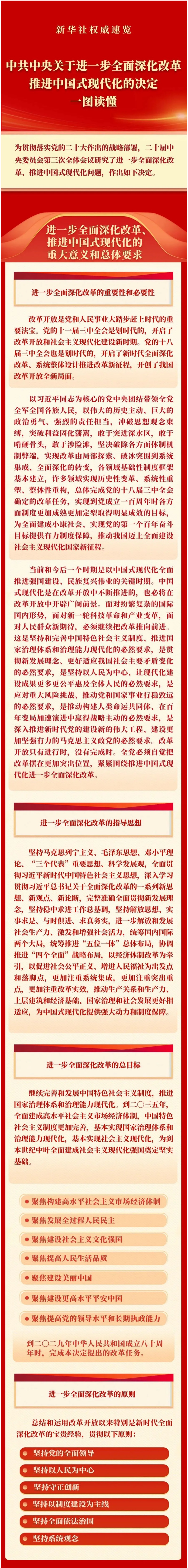 中共中央關于進一步全面深化改革 推進中國式現代化的決定 (2024年7月18日中國共產黨第二十屆中央委員會第三次全體會議通過) 為貫徹落實黨的二十大作出的戰略部署,二十屆中央委員會第三次全體會議研究了進一步全面深化改革、推進中國式現代化問題,作出如下決定。